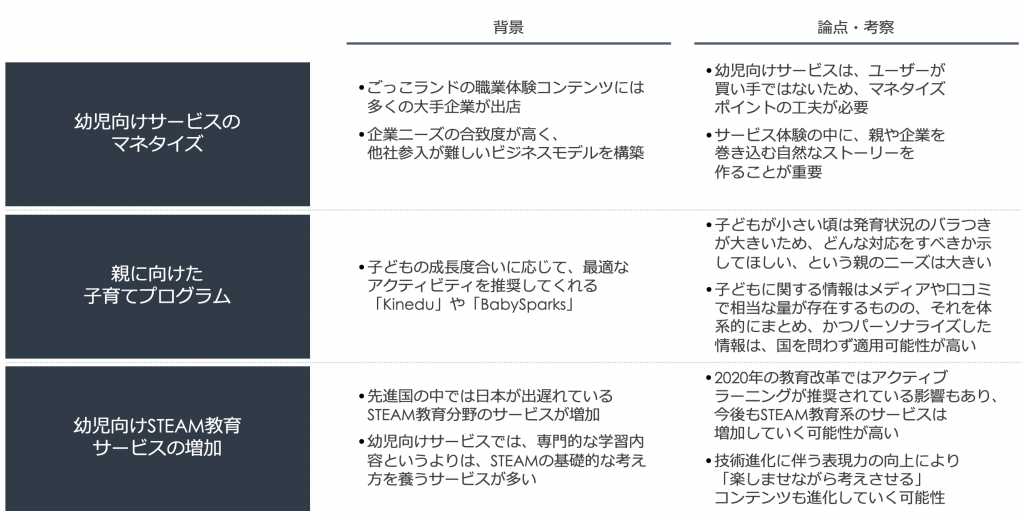 幼児向けのサービスは、ユーザーである子どもが購入意思決定者ではないため、親に対して価値を訴求できなければ、マネタイズが難しい領域です。その中で、ごっこランドのような、ユーザーには無料アプリを提供することで利用のハードルを下げながらも、親・企業のニーズに応えマネタイズするビジネスモデルは稀有な存在であるといえます。