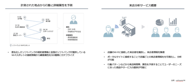 全国のソフトバンクWi-Fiスポットから獲得したユーザー情報をもとに、店舗のWi-Fiと接続することで、来店客の属性を可視化するサービスです。