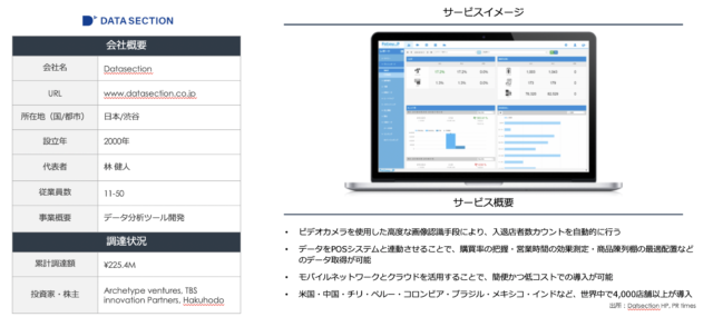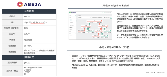 ABEJAは小売店向け来店客導線分析ツール「ABEJA Insight for Retail」を提供する、ディープラーニング技術を得意とした企業です。