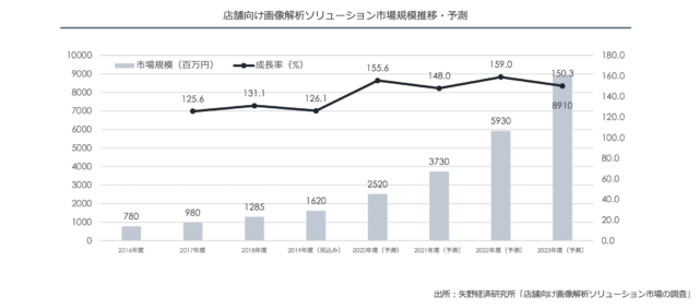 アパレルや小売業者などの企業を中心に、カメラを通じて取得した映像をAIが分析し属性の推定などを行う、店舗向けの画像解析ソリューション市場が年々拡大しています。