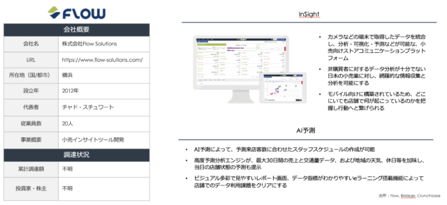 Flow Solutionsはカメラなどの端末で取得したデータを統合し、分析・可視化・予測などが可能な小売業界向けプラットフォーム「InSight」を提供しています。
