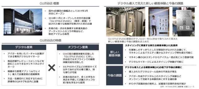 渋谷店はGU STYLE STUDIOのように店舗で商品を確認し、購入はEC上で行うショールーミング型店舗としてではなく、従来型の既存店舗の良さである店員に接客してもらい、その場で商品を購入して持ち帰ることができるなどのオフライン要素を活かしつつも、GU STYLE STUDIOで活用されたデジタル要素を取り入れたショールーミング型店舗を実店舗運営に当てはめた初の事例となっています。