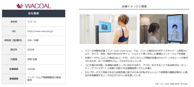ワコールでは、2019年5月より、セルフサービスで計測、商品の検索、試着、購入までできる体験型店舗「ワコール3D smart & try」の展開を開始し、現在、関東、甲信越、北陸、近畿、九州・沖縄と導入店舗を広げています。