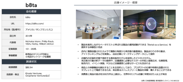 b8taは、VRやIoT家電をはじめとしたイノベーティブな商品を販売しながら、ベータテストと呼ばれる製品の運用試験ができる「Retail-as-a-Service(サービスとしての小売)」を提供する小売店舗です。