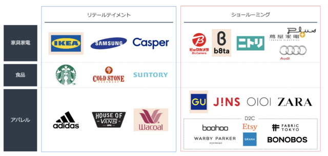 今回はリテールテイメントとショールーミングを業界別に①家具家電②食品③アパレルの3種類に分類しました。アパレルでは、さらにD2Cブランドを区分して企業をご紹介します。