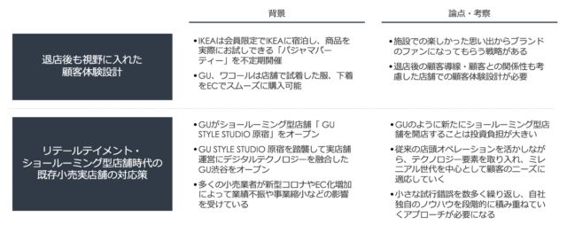 小売業界において新たな体験が重視されるようになり、国内外でリテールテイメントとショールーミングに対応する店舗が増加している一方で、「GU STYLE STUDIO」のように新たにショールーミングにのみ対応する店舗へ投資することは、新型コロナウイルスやEC利用増加によって業績不振や事業縮小などの影響を受けた多くの小売業者にとっては投資負担が大きく、現実的な選択肢になりにくいと考えます。
