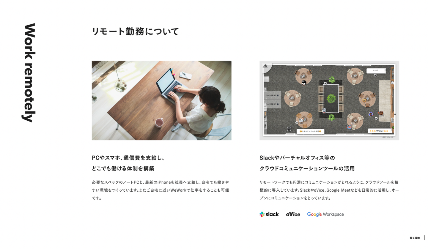 またフレックス制や裁量労働制も取り入れているので、場所だけでなく時間も柔軟に働くことが可能です。