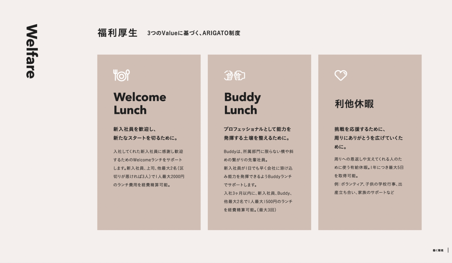 たとえば「利他休暇」は弊社のValueが反映されている福利厚生で、ボランティアや子どもの学校行事、出産立ち会い、家族のサポートなど周りへの恩返しや支えてくれる人のために使う有給休暇です。
