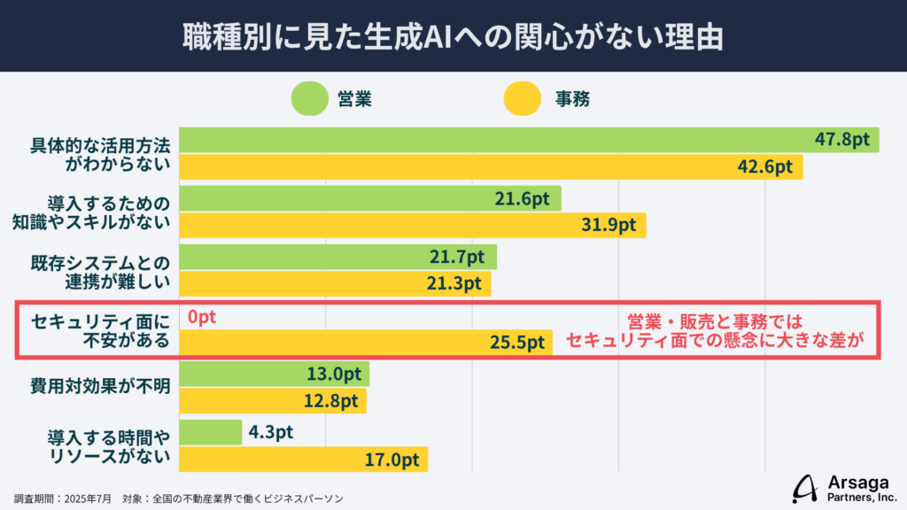 職種別に見ると、営業職では活用が比較的進んでいるのに対し、事務職では「セキュリティに不安がある」とする声が25.5ptと高く、慎重な姿勢が目立った。