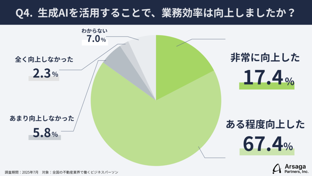 不動産業務においては、営業資料の作成、契約書の文案、問い合わせ対応、社内報告文の下書きなど、言語ベースの業務が数多く存在します。こうした領域で生成AIを活用することで、作業時間の短縮や表現の最適化、提案精度の向上など、業務効率化の効果を感じている人が多いと推察されます。