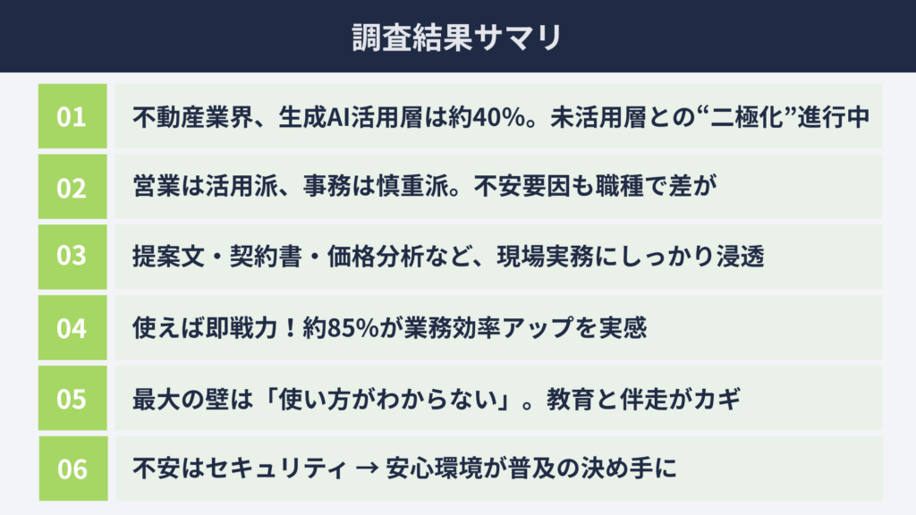 こうした状況を踏まえ、不動産業界における生成AI活用の拡がりには、業務フローに即した導入設計・教育体制・社内ルール整備といった“実践的な支援”が欠かせない段階に入っていると考えられます。