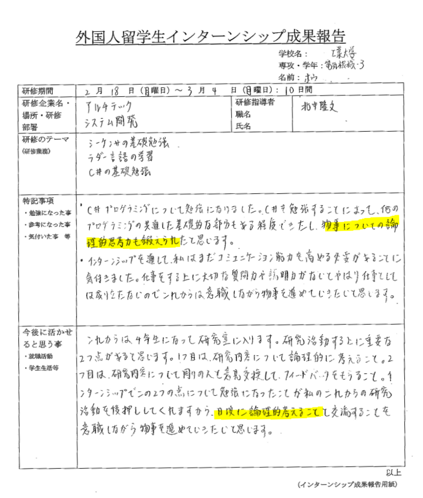 今月、新たにインターンシップを終了された留学生の方がいらっしゃいますので、ご紹介いたします。
