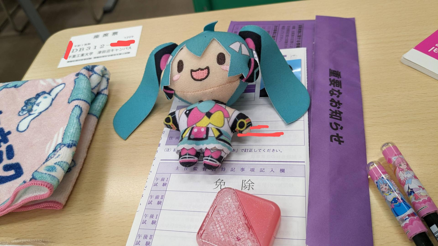 ↑私のお守りは初音ミクの小さなぬいぐるみ。試験中は出せないですが…。