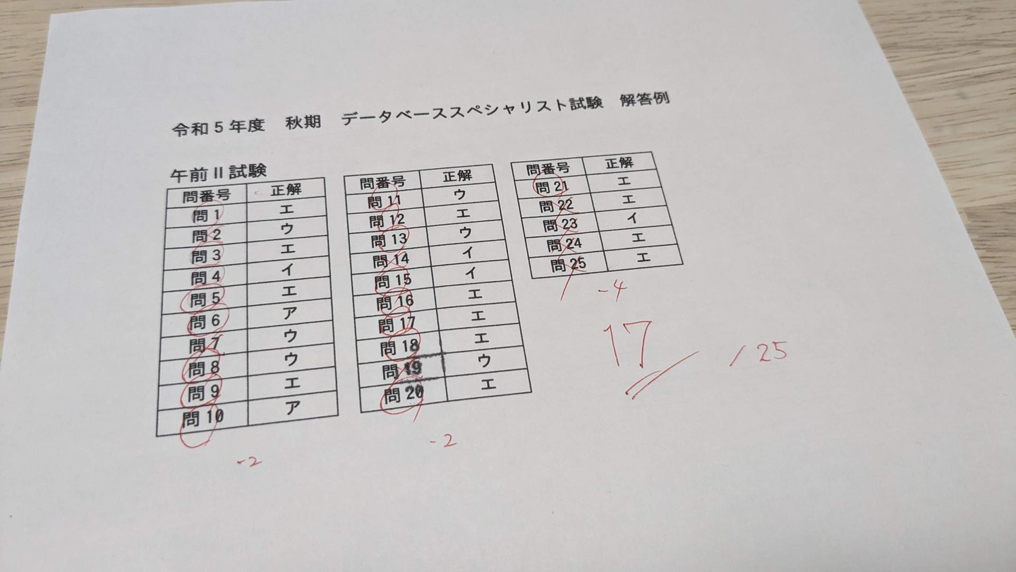 ↑2択を外す場面が多かった一方、対策したデータベース周りの問題はほぼ正解。