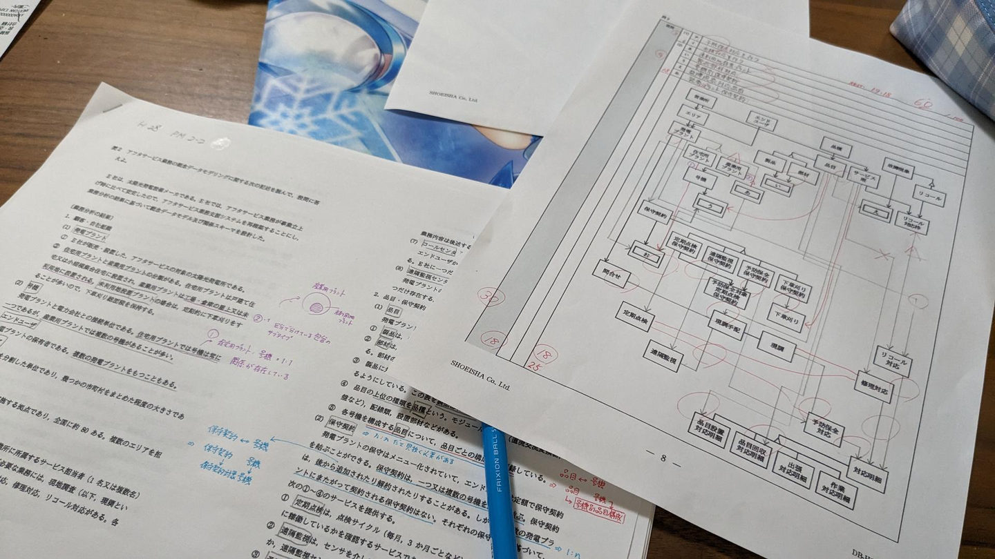 実務に則した…とまでは言わないまでも、業務状況からどのような設計にしたらよいか、というのを解いていくので、トレーニングを重ねてもやっぱり難しいです(午後Ⅱで散ってしまう受験生がやっぱり一番多い)。