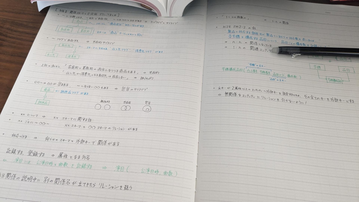 ↑答えは文章の中にある。業務概要からデータベース設計に落とし込むための"気づき"を確実にするために解説を読みながらメモも取っていました