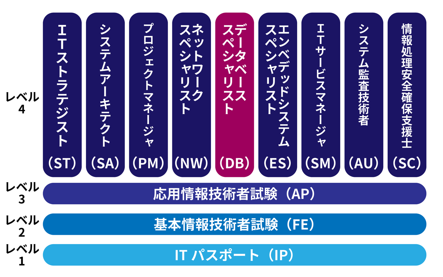 ↑IPAのHPの試験区分を一部抜粋。DBは基本情報技術者試験、応用情報技術者試験の更に上。