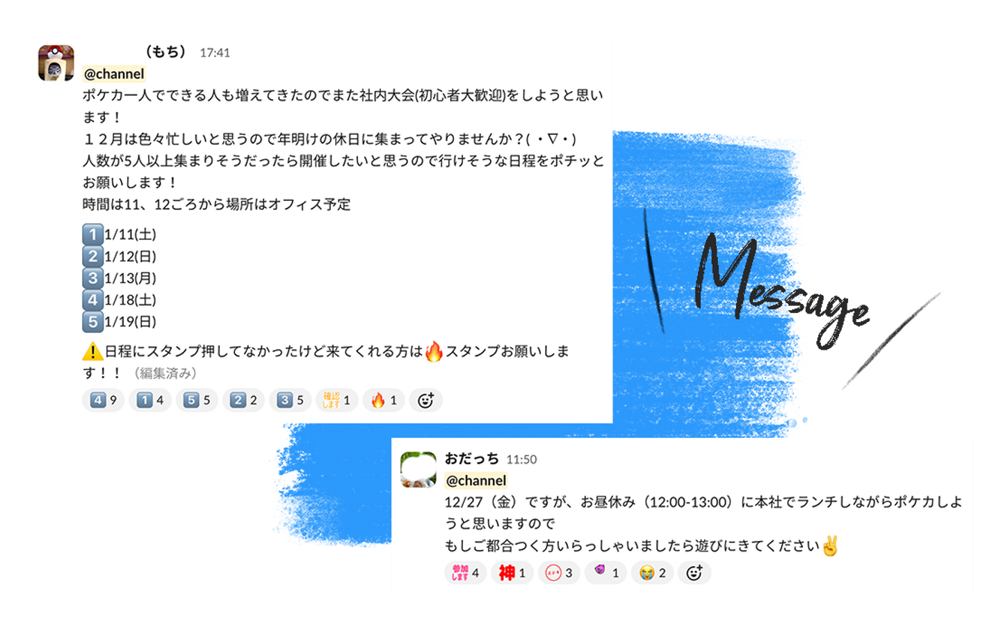 ↑上記のように部員から「ポケカやりませんか!」というお誘いコメントが投稿され、参加者を募ります!