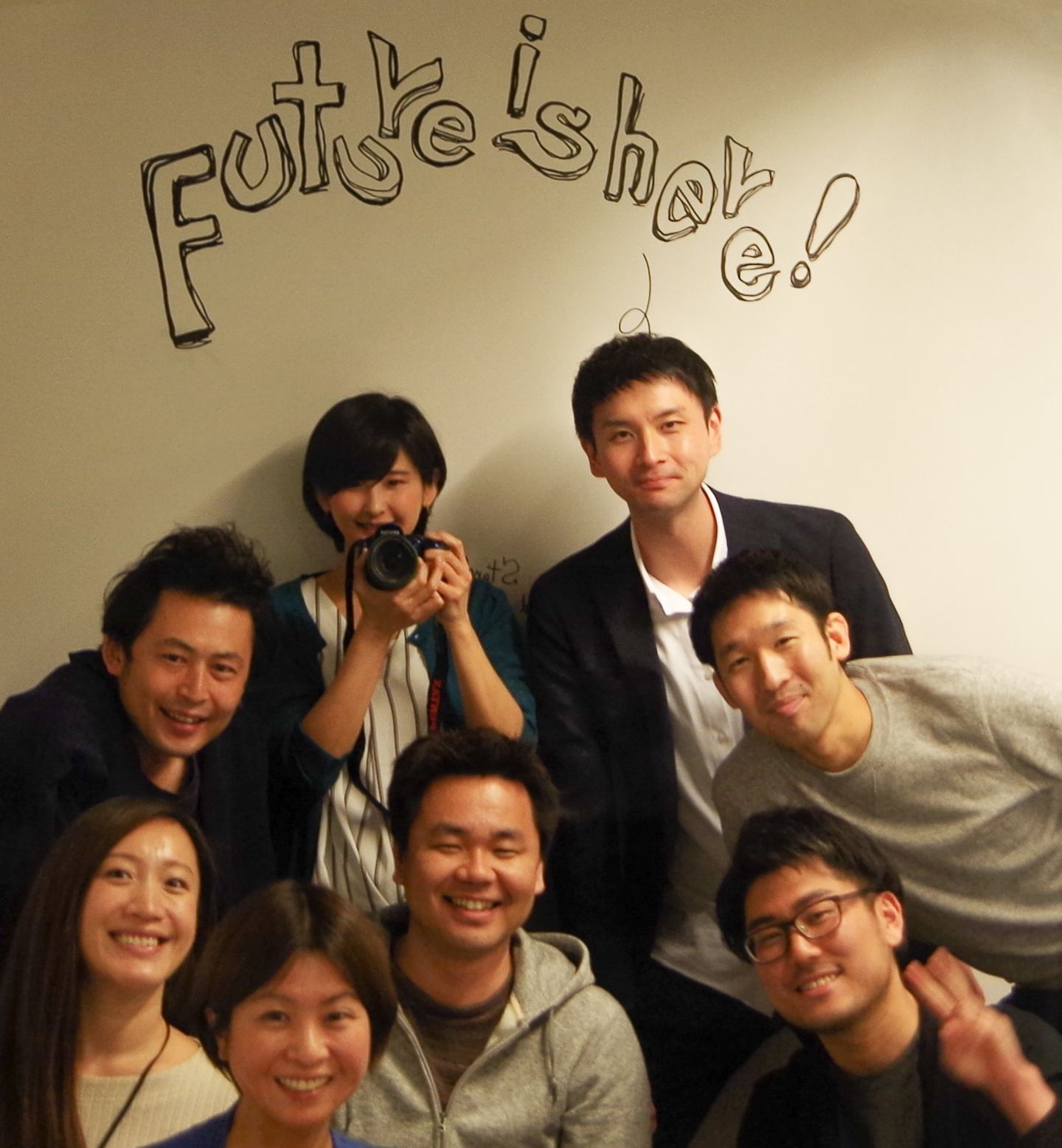 「Future is here(未来はここにある)」と書かれた前で、KAKEAIのメンバーと一緒の櫻井紫乃さん