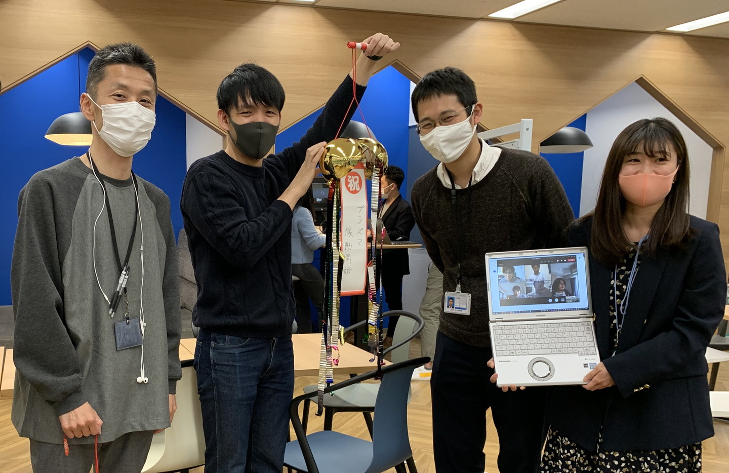 プロジェクトのローンチの日の光景。久しぶりに出社してくす玉を割りました