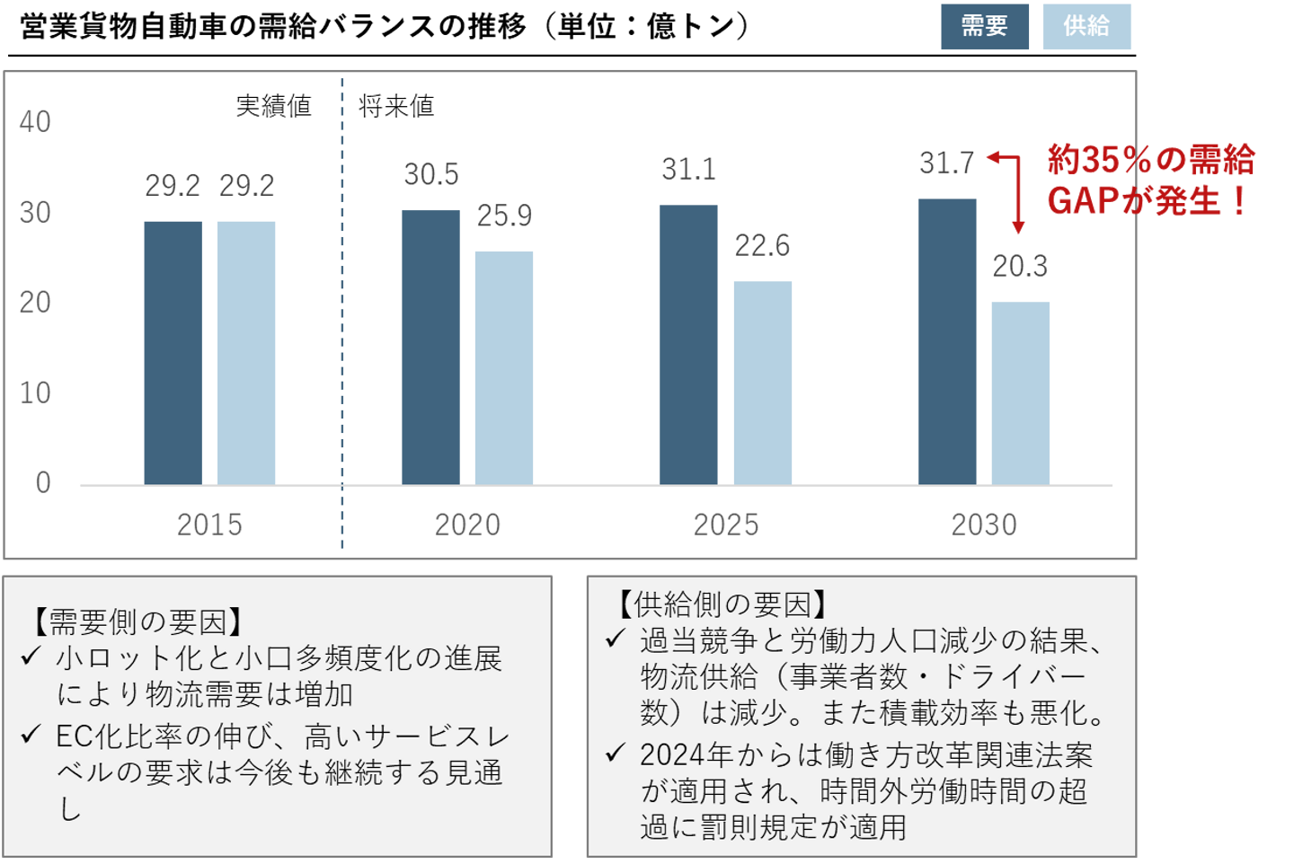 何故運送業界に「DX」が必要なのでしょうか。物流クライシスが叫ばれる現在の状況では、荷主から運送会社に徐々に力関係がシフトしつつあることは間違いありません 。実際、2030年にはトンキロベースで35%もの物流GAPが発生するとの見方もあります。