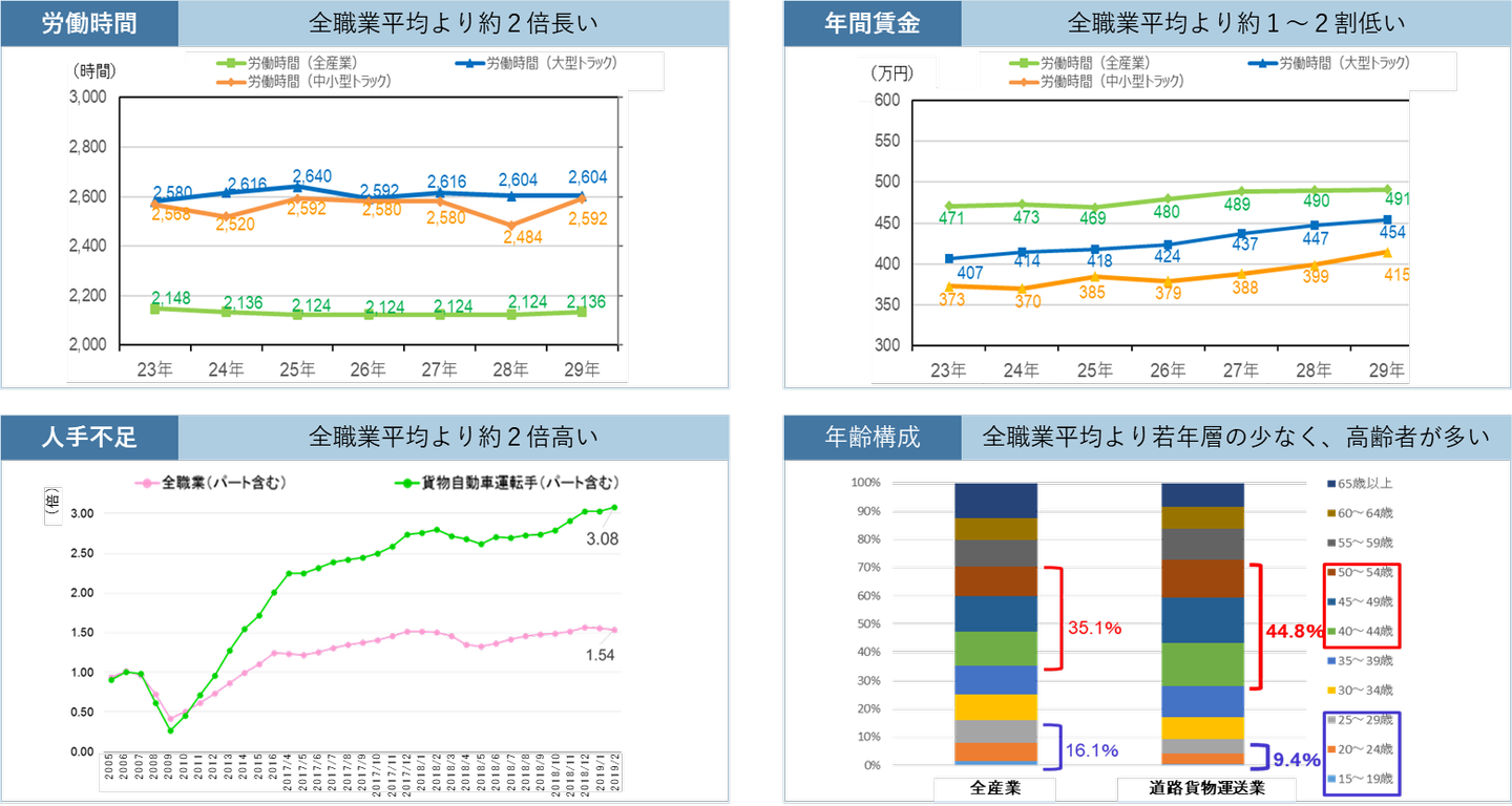 国土交通省によると、運送業界の労働時間は全職業平均と比較して2倍長く、年間賃金は全職業平均より2割低いのが現状です。人出不足も深刻であり、働き手の内訳としても若年層が少なく高齢者が多い状況にあり、人出不足は極めて厳しい現状になっています。