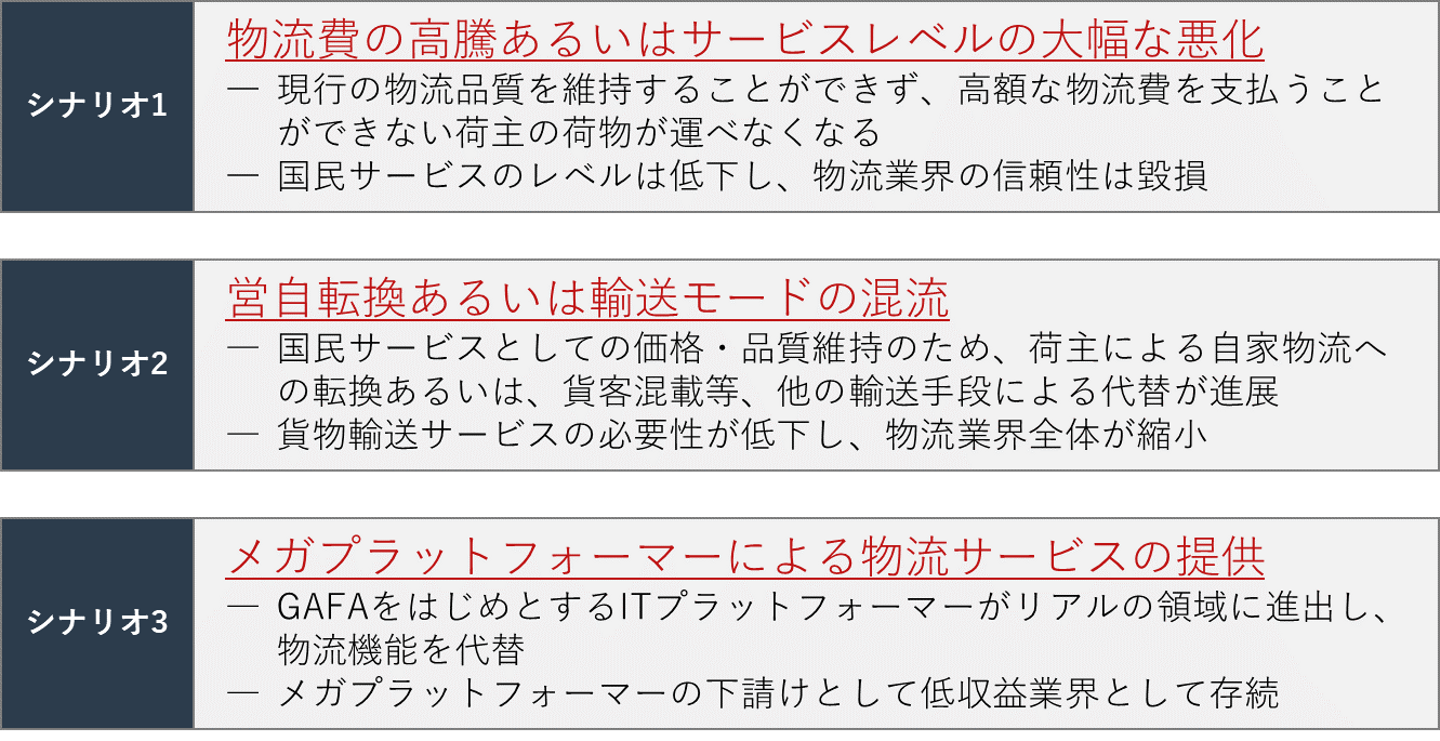 このまま人出不足や低賃金の状況を改善できない場合、深刻な人出不足に陥ることは間違いありません。本当の問題は、供給力不足が市場メカニズムを通じた適正な運賃向上につながらず、運送業界の価値そのものを毀損する結果に結び付いてしまうことです。このことを悲観的に考えると。次の3つのシナリオが予測されると考えています。