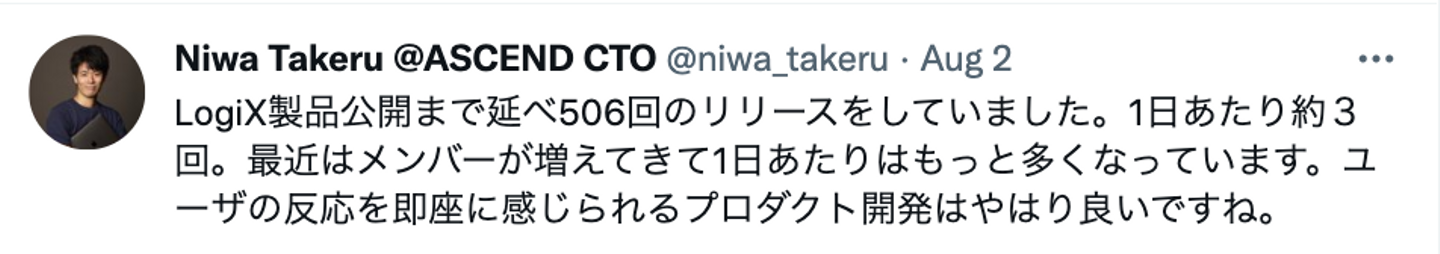 ちなみにロジックスは、現在は1日3回程度リリースを行いながらの開発を手がけているのですが、弊社のCTOによると、正式提供までのリリース回数は計506回にのぼるそう。