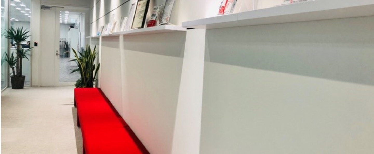 2018年7月よりリニューアルされたロゴとクラウドシステム紹介映像を投影するモニターがあり、清潔感があり広々とした空間が広がっております。