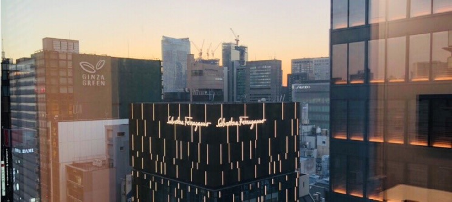 なんと言ってもガラス張りで11Fなので銀座のそれぞれの時間帯の景色を楽しむことができます!今日は夕方の景色をお見せします!朝、夜も非常にきれいなのでぜひ皆さん気軽に遊びにおこし下さい!