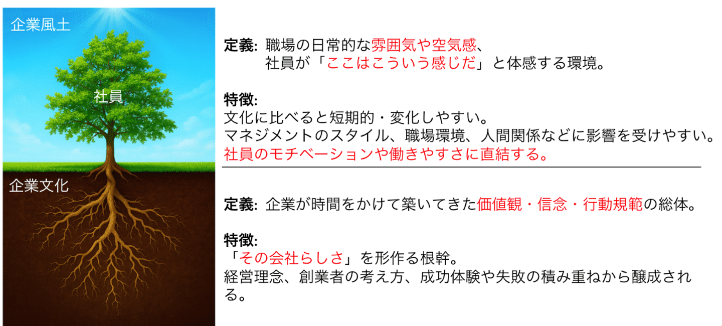 組織の基盤となる「企業文化」と、日常的な雰囲気を示す「企業風土」は以下と定義して考えています。