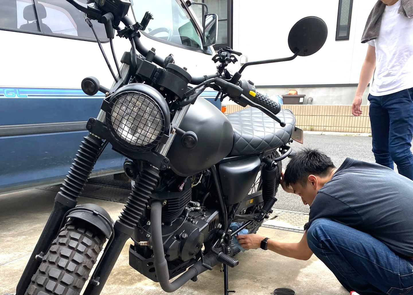 |同じバイクの趣味を持つ先輩社員のガレージでカスタム中の写真です。