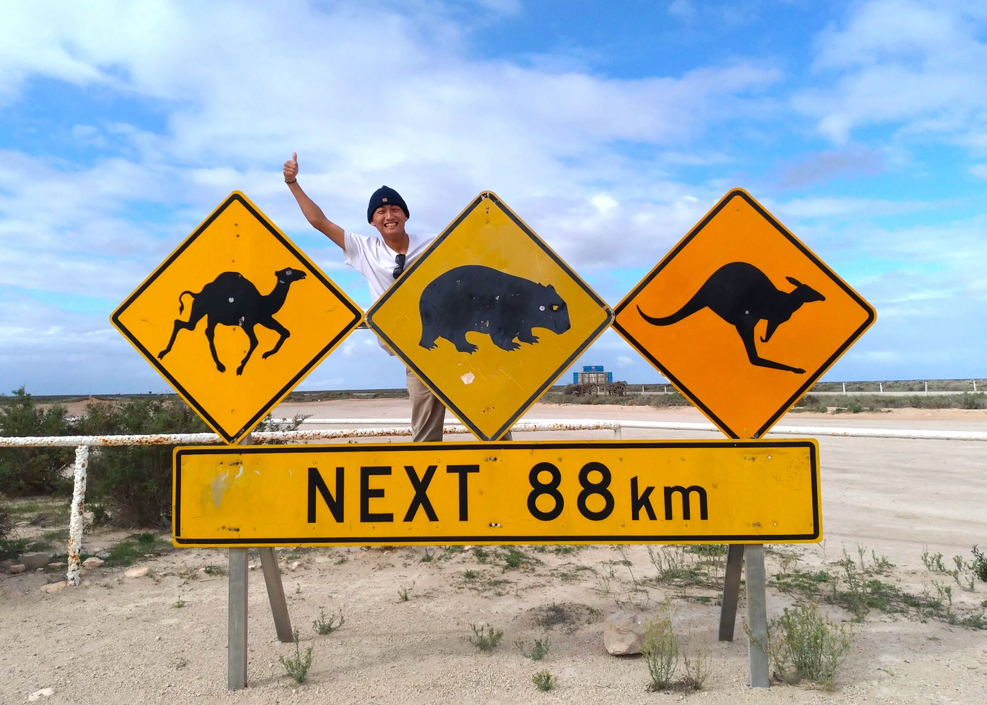 |貯めたお金で車を買って友人と一緒にオーストラリアを1周!当時世界で最も長い直線道路での記念写真です。