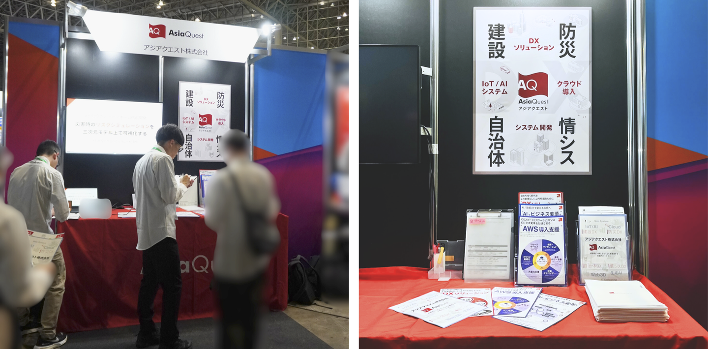 展示ブースでは、アジアクエストのこれまでの主な実績や、AWSの導入支援の事例などを紹介。