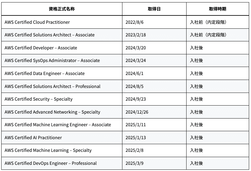 この体験談を書いた理由 こんにちは。アジアエスト デジタルイノベーション部の足立です。 私は非エンジニアでありながら、AWS全12種類の認定資格(通称「全冠」)を取得し、「2025 Japan AWS Jr. Champions」「2025 Japan All AWS Certifications Engineer」の2つに選出されました。 この体験談を書こうと思ったのは、私のような非エンジニアでも、地道な努力を続けることで道が開けるということを、同じような境遇の方々にお伝えできればと思ったからです。特別な才能や経験があったわけではなく、継続することや周囲のサポートを得ることの大切さを実感したので、それが少しでも参考になれば幸いです。