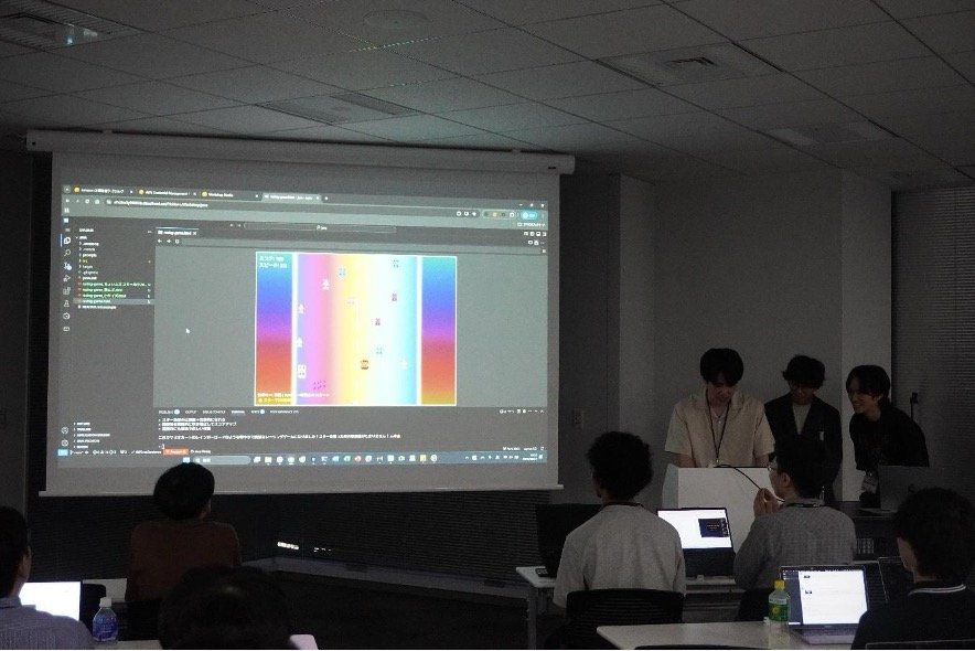 最後は制作したゲームの発表 最後に制作したゲームの発表です!!代表して3チームが発表を行いました。 ゲームの概要説明しながら簡単なデモを行います。ゲームの内容に加えて、制作の過程や制作する上で工夫した点、苦労した点についても触れました。