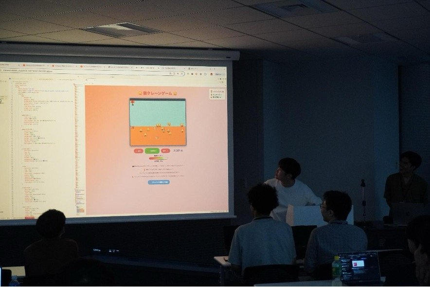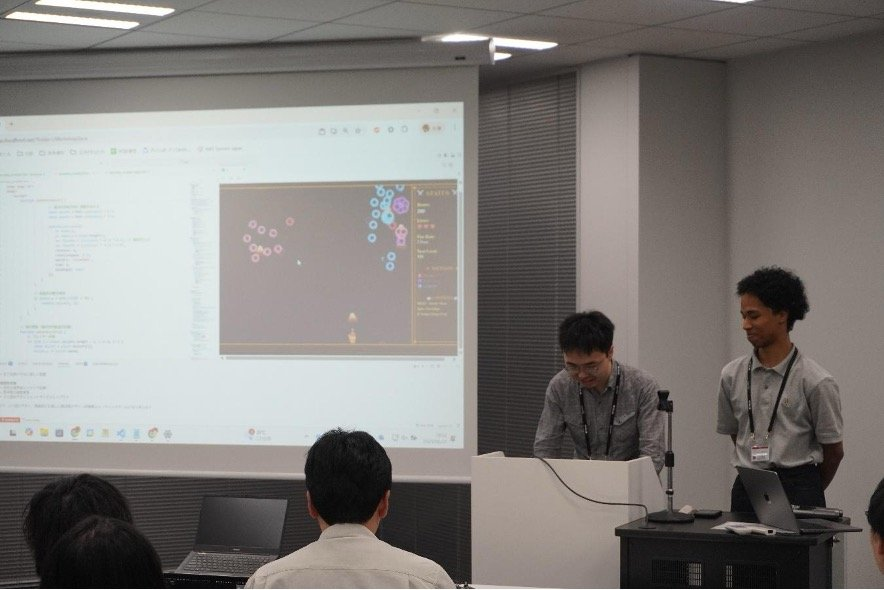 「Danmaku Q Shooting」ゲームの発表 今年の新卒ペアが作成したのは「Danmaku Q Shootingゲーム」です! 最初は単なるシューティングゲームを作成し、そこから指示を加えて改良を図ったとのことです。登場するキャラクターをAmazon Qをイメージしたキャラクターにしてほしい、自分達が撃つ弾の速度を調整したい、弾幕を「Q」にしてほしいなどの指示を出したそうです。また、敵が撃つ弾を「美しく、幾何学的な模様」にして指示を加えたところ、自分達が理想とするようなゲームに近づけたようです。 講師の方から「LLMが確率的にトークンを予測するため、できるだけ具体的に指示を与えることがコツ」で、今回特に「幾何学的な」というような具体的な指示が良かったというコメントがありました。 1チーム目の発表が終わったところで、セミナー終了時間もあとわずかとなり、発表はあと2チームとなりました。 ただここで、発表グループに贈られる景品(ピンバッチ)が残り1つとなり、残り2チームは、景品をかけて制作ゲームのプレゼン対決をすることに。