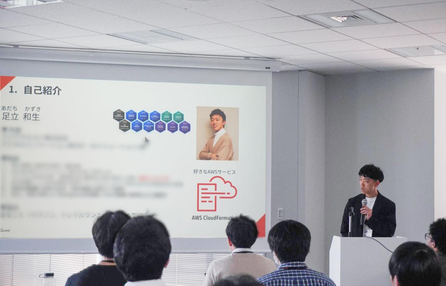 ライトニングトークは、2025 AWS Jr.Champions選出を目指す先輩社員2名(入社3年目)が以下のテーマについてお話をしました。 ・技術職じゃない私がAWSにハマった話~AWS Jr. Championsへの道のり~ ・AWS Summit Tokyoへ行こう!