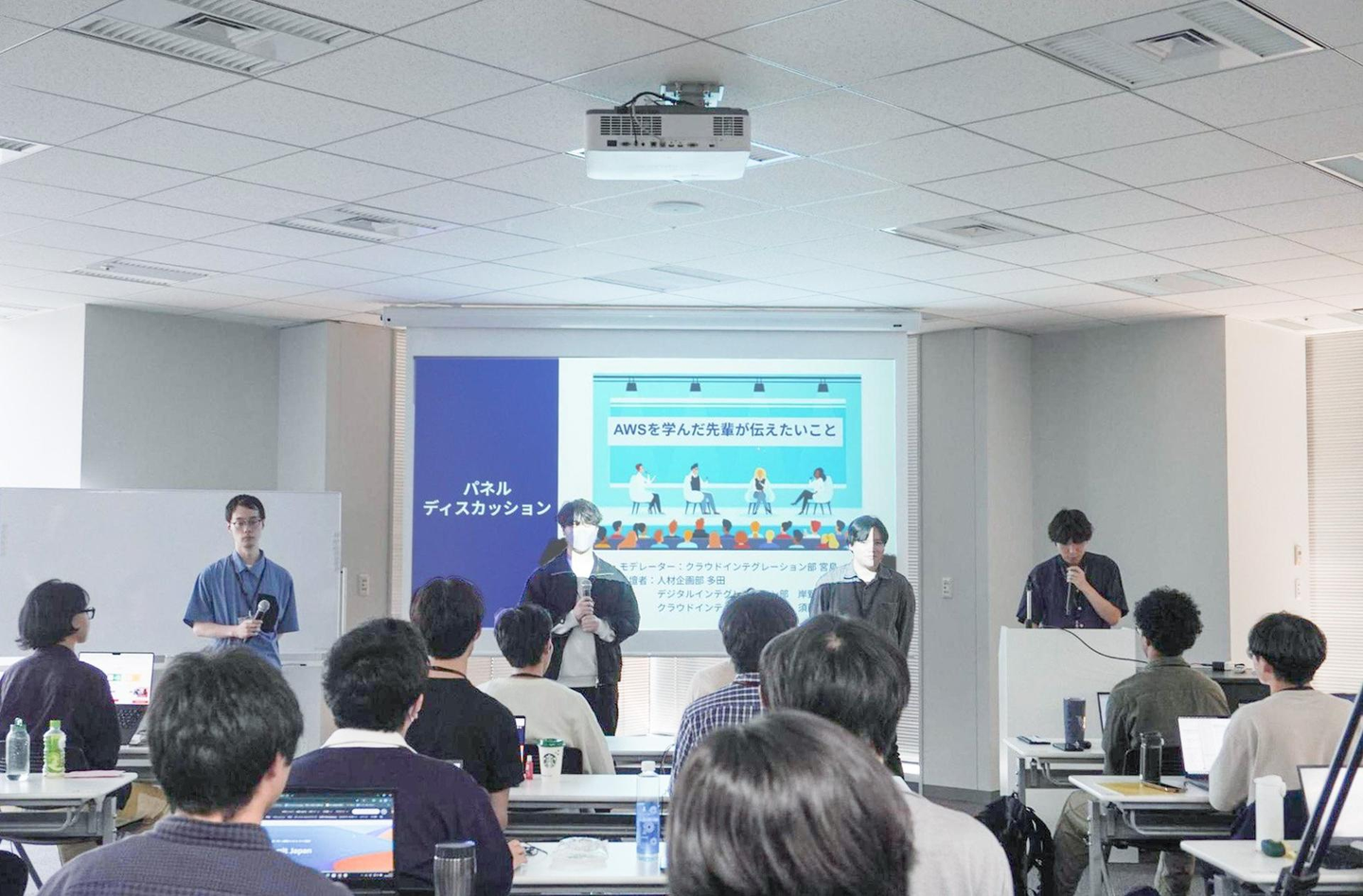 続いては、パネルディスカッションです。 クラウドエンジニア、アプリケーションエンジニア、人材企画とそれぞれ職種が異なる3名の先輩社員が「AWSを学んだ先輩が伝えたいこと」というテーマで登壇をしました。 自身のAWSを学び始めたきっかけや、学習経験、苦労、AWSを を学んで良かったこと、学びが業務で活きたシーンなどについて、新卒社員に向けたリアルなメッセージを届けました。
