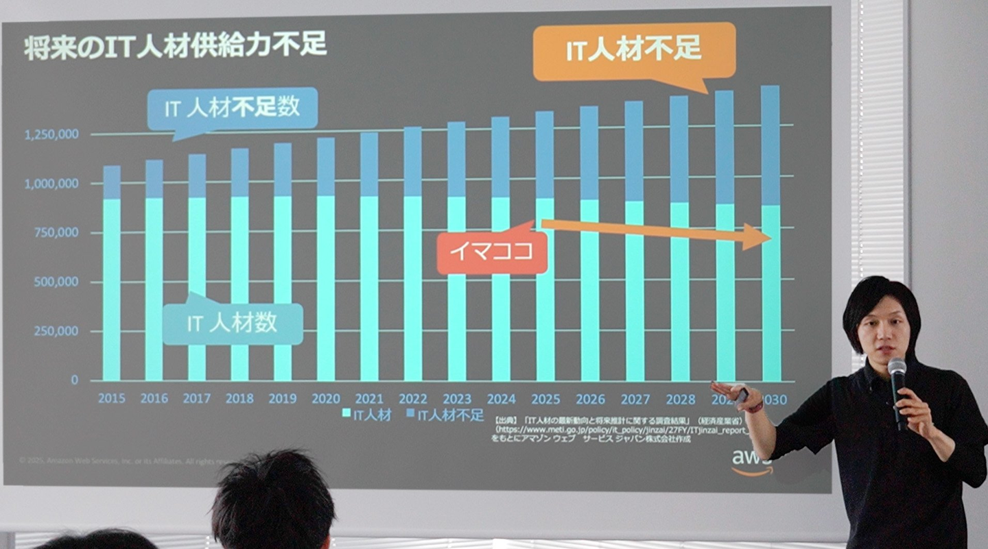 ■ 今求められる人 2030年には、クラウドエンジニアを含むIT人材が大幅に不足する見通しに触れ、これからの時代はインフラの提案だけでなく、フルスタックな人材が必要とされることや、案件の増加に伴いAWS人材不足が顕在化しているとのことで、今クラウドを学ぶ意義やアドバンテージについてお話がありました。 AWSから提供されている数多くのサービスを組み合わせて、ベストプラクティスに基づいた提案/設計/構築ができる人=ソリューションアーキテクトは、とても貴重な人材であるという話しを受けて、皆食い入るように話を聞いていました。