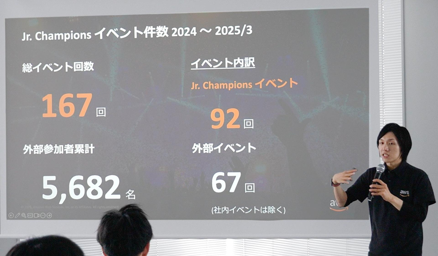 AWS Jr.Championsに求められること、招待されるMeetUp(イベント)での活動内容や、Jr.Champion達がそれぞれ行っている活動について紹介がありましたが、特に印象的だったのは、 「AWS Jr.Championsになって人生が変わった」 「狭き門を突破したメンバーなので、圧倒的なモチベーションを持つ精鋭集団」 「他社の同世代の仲間達と繋がることができる貴重な機会である」 「Jr.Championsが1年間で行った総イベント回数:167回!!」 「スケジュールが0からぎっしりに変わった」 「AWS Jr.Champiosを目指すだけでも人生が変わる」 というリアルな声が紹介され、会場から驚きの反応がありました。
