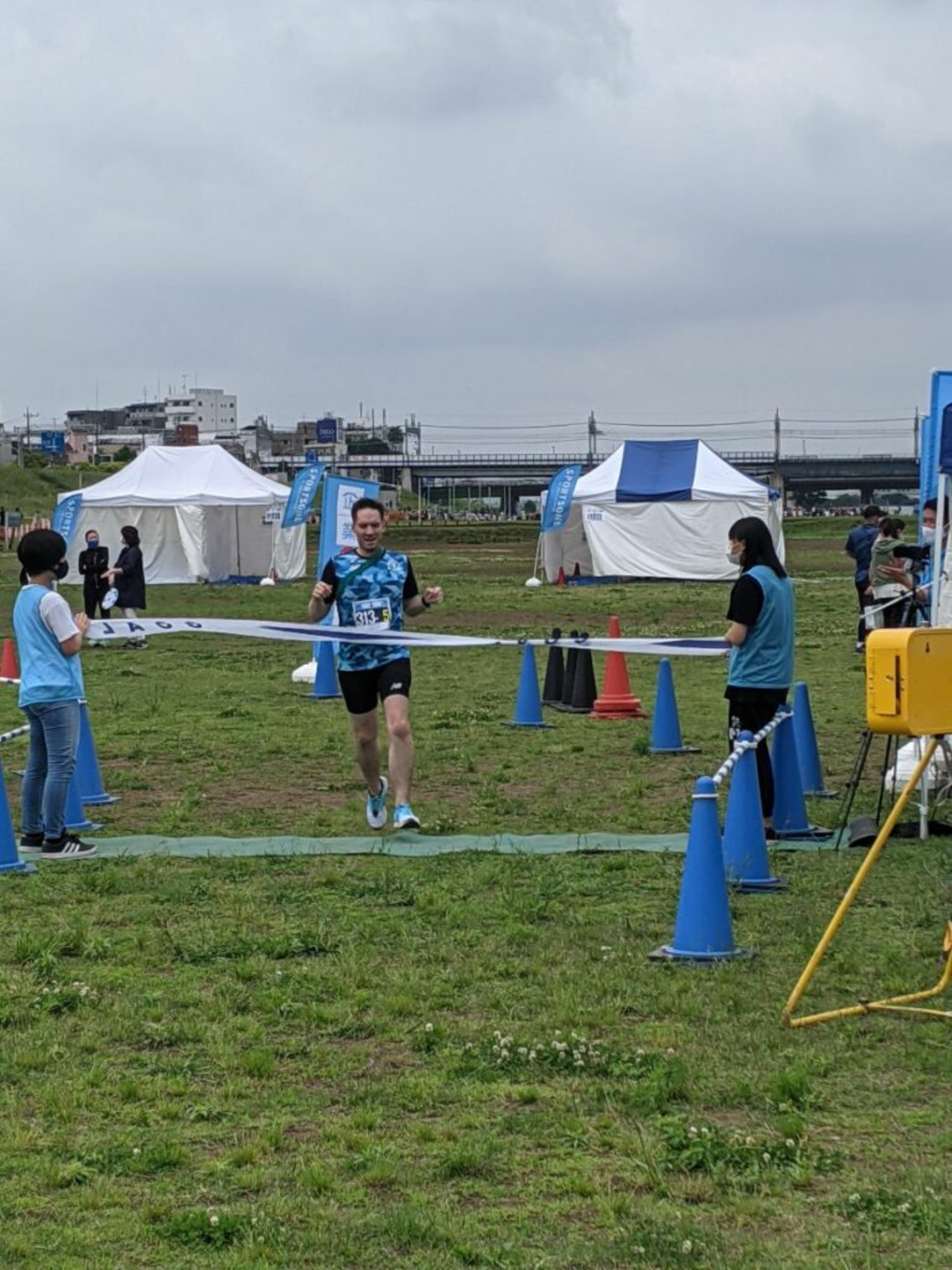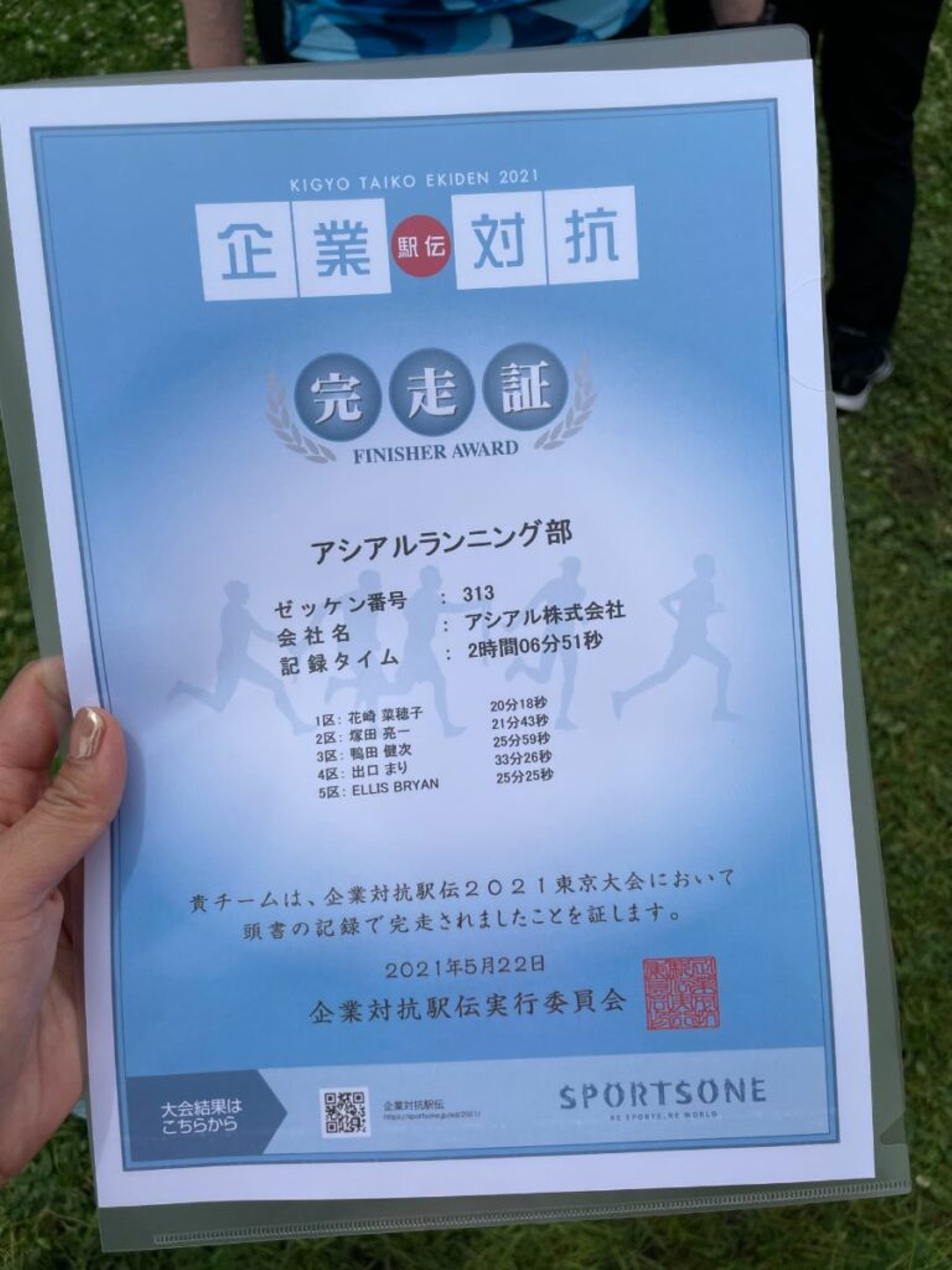 5人でタスキをつないで、アンカーのブライアン選手がゴールテープを切りました。