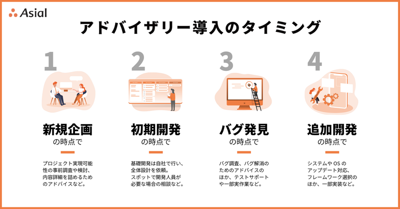 アシアルの技術と経験を伝えることが国内企業の技術力アップにつながれば、私たちにとっても大変うれしいことです。内製、外注で迷ったときには、アドバイザリー契約という選択肢も思い出してみてください。