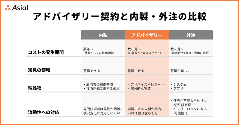 先にアドバイザリー契約は「スポットで契約でき、継続的なコストが発生しつづけない」と述べました。では、内製、外注、アドバイザリー契約はコスト面でどのような違いがあるでしょうか?