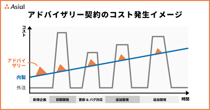 アドバイザリー契約自体は、工数をベースにコストが発生。ただし、社内にエンジニアがいることが前提のため、内製(給与)にアドバイザリー契約のコストがプラスされます。社内エンジニアのスキルアップと共に、必要なアドバイスは減るためコストは減り、最終的には不要になることも。