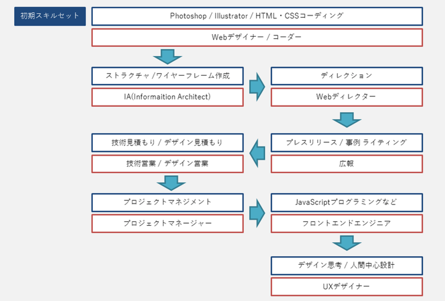 初期スキルセット(図・中央上)から現在(図・右下)に至る鴨田のスキル獲得過程。