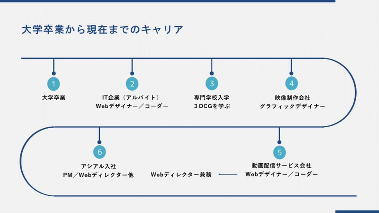 「自分が働き始めたころ、Webデザイナーという職種はまだ新しくて。将来どうなるかわからなかったので、早めにWebデザイナーじゃない領域までやろうかなと思ってアシアルに入りました。未だにWebデザイナーの将来は描きにくくて、キャリア形成するにはいろいろなことをやっていかないといけないなと。