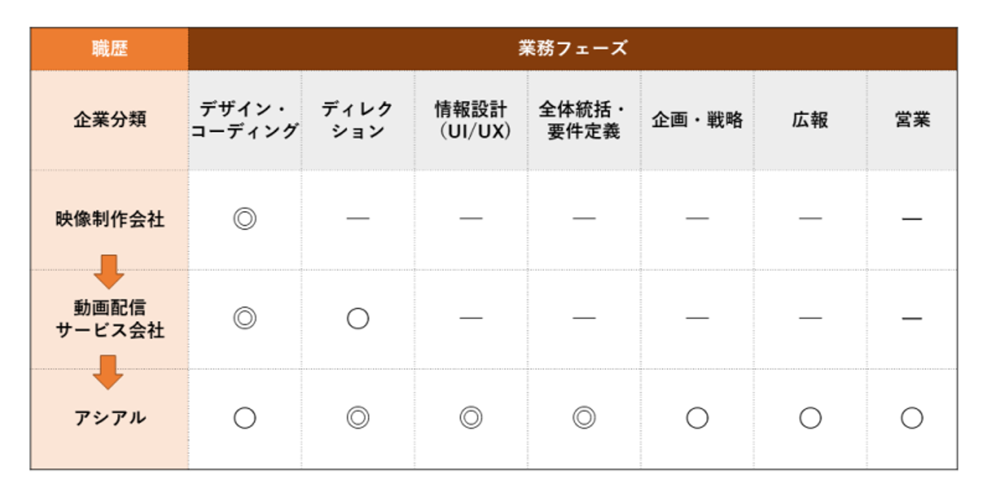 そんな鴨田の現在の肩書きは、Webデザイナー、Webディレクター、フロントエンドエンジニア、PM、技術営業、広報。それに加えて、デザインチームのリーダーとしてマネジメントを行なっていたり、ブランディングチームとしても動いていたり。下表が簡易的にまとめたキャリアマップです。◎はメイン業務。現在鴨田がアシアルで幅広い業務に携わっていることがわかります。