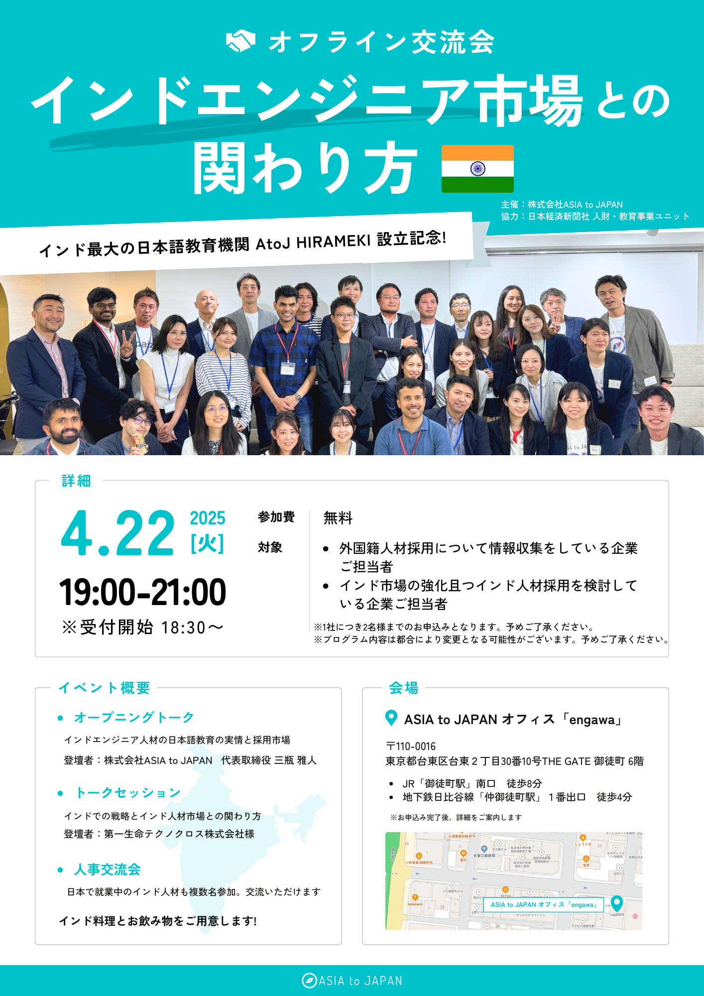 こうした取り組みの一環として、今後インド人材採用を検討する日本企業を対象に、オフラインでの交流会を2025年4月22日に開催しました。