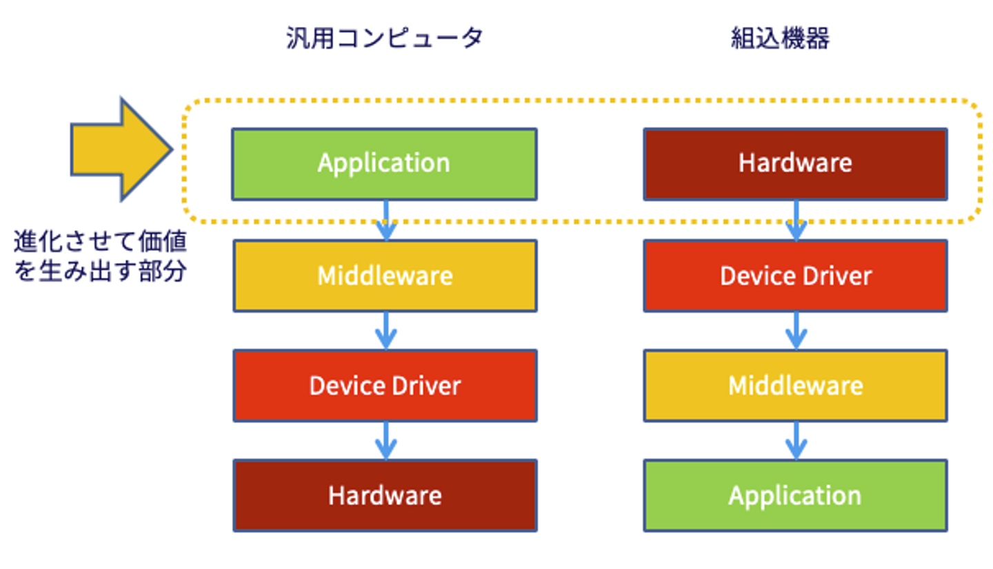 - 組込機器:ハードウェア側で目的特化の最適化を行い、その上に特化したソフトウェア機能を載せる。